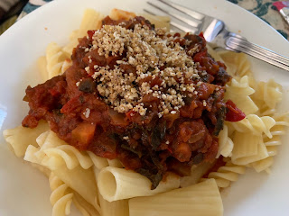 This is the garden Bolognese recipe from Vegan Italiano. I love how chunky it is from all the veggies. It was delicious on rigatoni and fusilli pasta. I topped it with almond “Parmesan”.